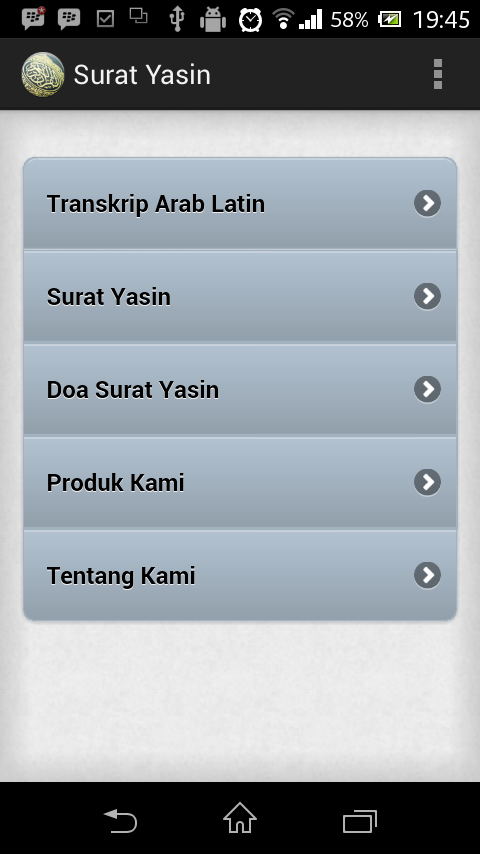 Dalam format pdf, silahkan klik disini. Sengaja admin buat halaman khusus yasin menggunakan latin, dimaksudkan untuk membantu anda yang belum bisa membaca … Siapa saja yang senang membaca surat yasin akan memiliki hati yang lebih tenang. Berikut bacaan surat yasin 83 ayat, beserta tulisan latin dan tulisan arab 10. Sir i also want to download other surah like surah rahman,surah mulk,surah kahf,surah waqiah just like this format like surah yasin.that i already download from your website.if you have then please send me in pdf file. Artikel kali ini berisi bacaan surat yasin online lengkap dalam bentuk arab, latin dan terjemahan. Aplikasi ini di isi dengan audio mp3. İnna cealna fı a'nakıhim ağlalen fe hiye ilel ezkani. 2 buku yasin dan tahlil. Surah yasin with urdu translation is pdf featuring the full verses of surah yaseen along with their urdu translation. Diatas adalah bacaan surat yasin dari ayat 1 sampai dengan ayat 83 lengkap dengan bacaan arab, latin dan artinya. Buat kamu yang sering baca yasin online, lebih baik simoan halaman ini. Pasti anda tidak asing lagi dengan.