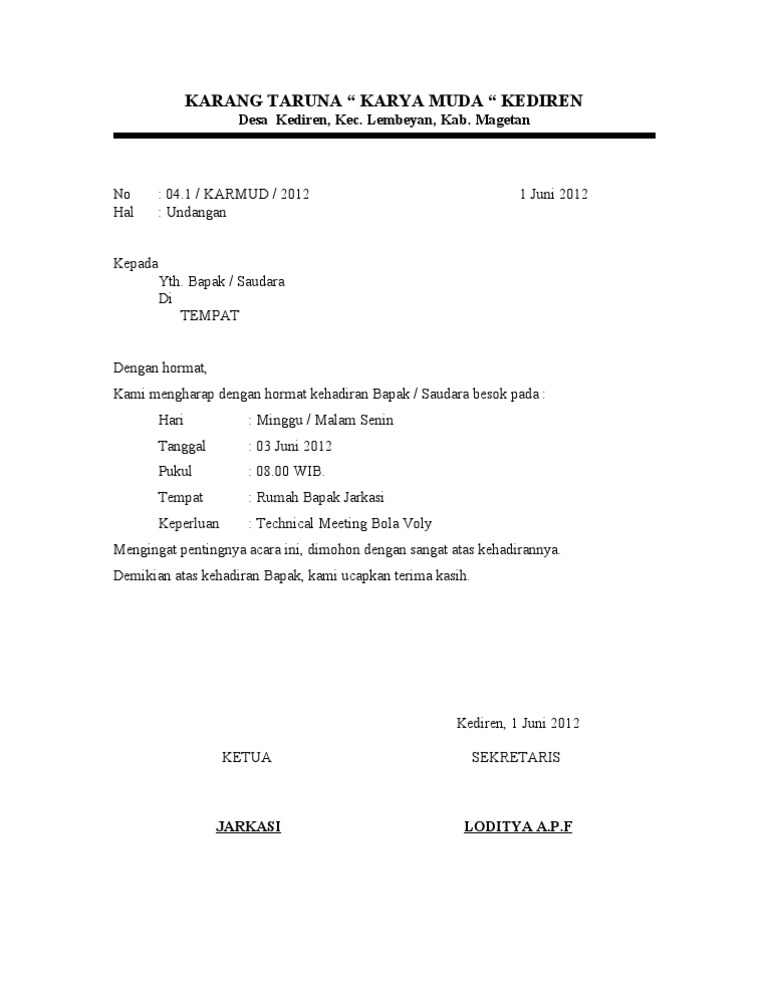 Contoh Surat Undangan Rapat Karang Taruna from imgv2-2-f.scribdassets.com Contoh surat undangan rapat osis. Namun tentu saja ada banyak hal yang harus dipersiapkan, baik oleh panitia rapat ataupun dari peserta rapat yang diundang. Berikut ini terdapat beberapa contoh surat undangan resmi yang bisa kamu jadikan pedoman. Surat undangan dengan tujuan rapat karang taruna merupakan salah satu surat resmi, karena pada surat undangan rapat terdapat ada kepala su. Contoh surat undangan rapat pembentukan pengurus karang taruna. Pengertian surat undangan tidak resmi. Karena itu jika sebagian dari sobat mencari contoh desain surat undangan halal bihalal untuk karang taruna. Surat undangan sendiri terdiri dari surat undangan resmi dan surat undangan tidak resmi.